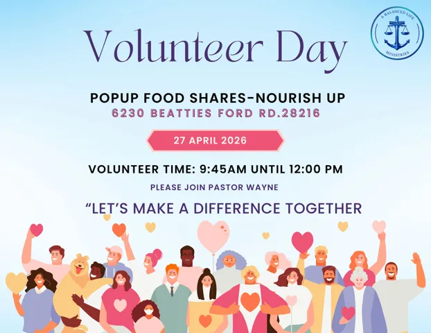 Experience the joy of serving our neighbors at our upcoming Volunteer Day. A Balanced Life Ministries invites you to join us for a Popup Food Share as we work to "Nourish Up" our local community.